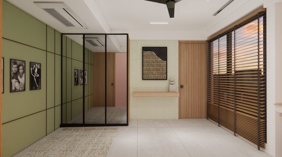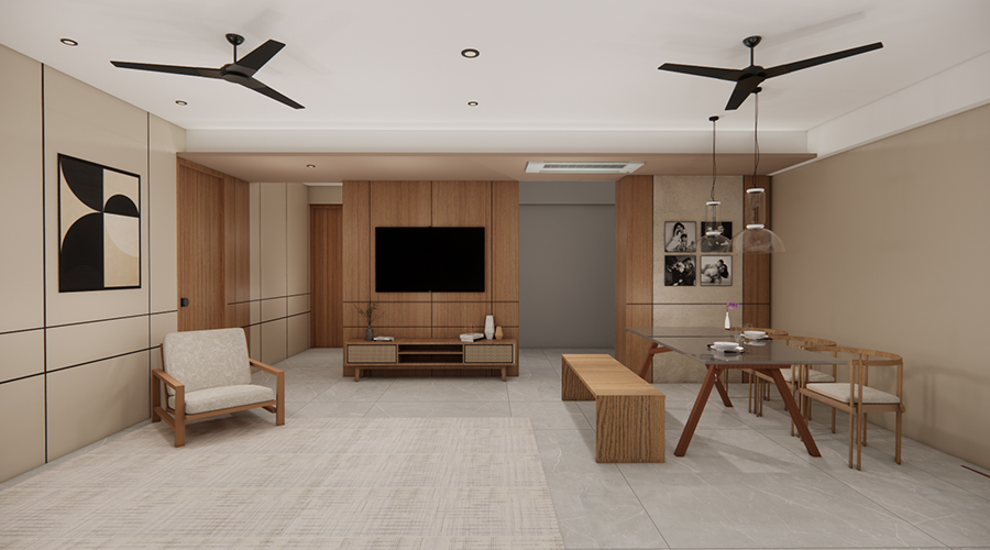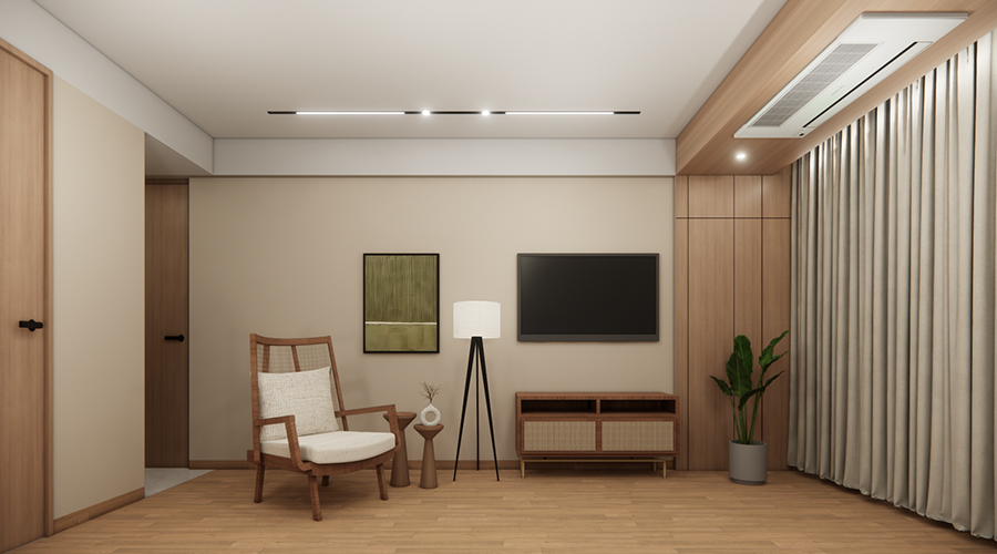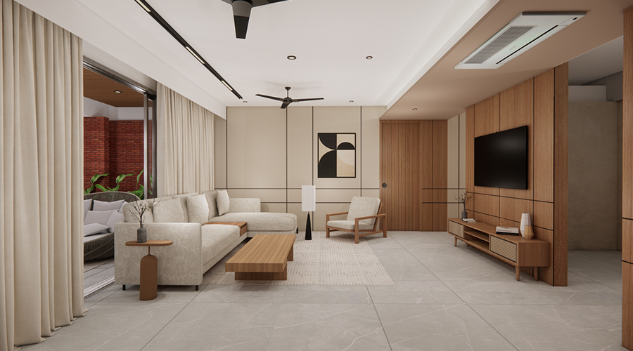 - Premium water-resistant PVC false ceiling with wooden finish.
